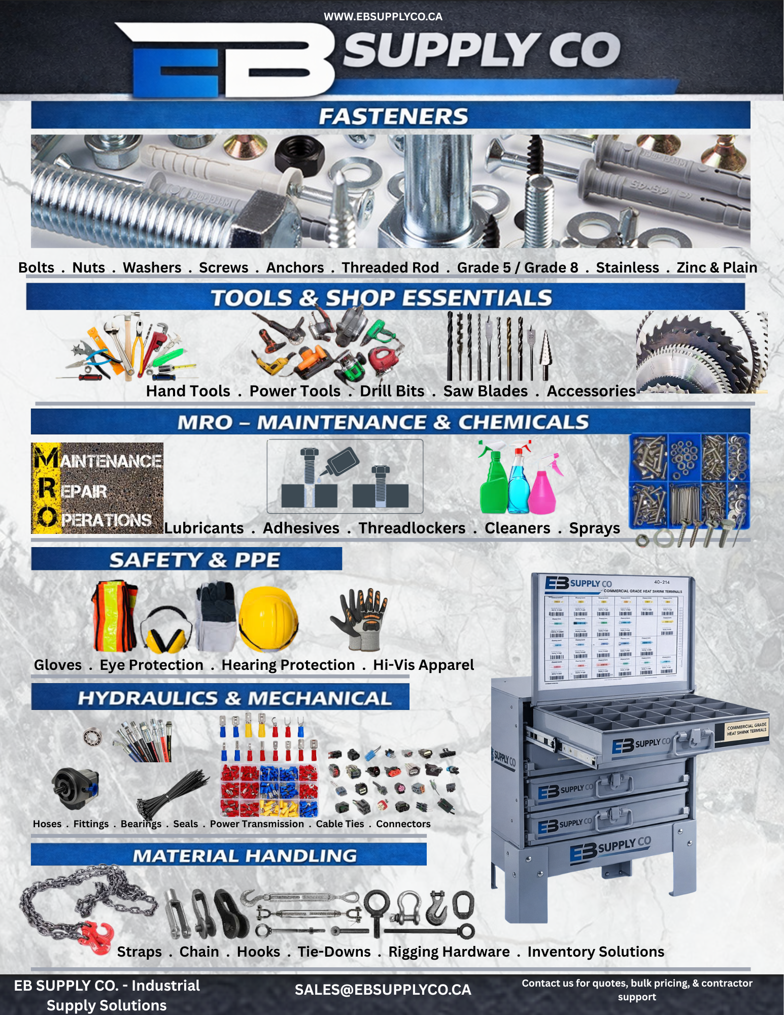We provide a wide range of mechanical and industrial supplies, including fasteners, tools, fittings, electrical components, safety products, and general MRO (maintenance, repair, and operations) items. Our focus is on reliable products used in commercial, industrial, and contractor applications.